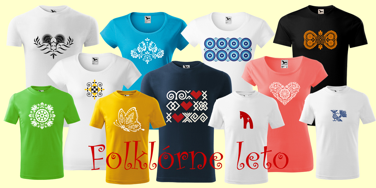 Tričká inšpirované ľudovými motívmi z rôznych častí Slovenska z Čičmian, Čataja, Trnavy, Trenčína, Vajnor, Jablonice, Šariša, Záriečia ... -